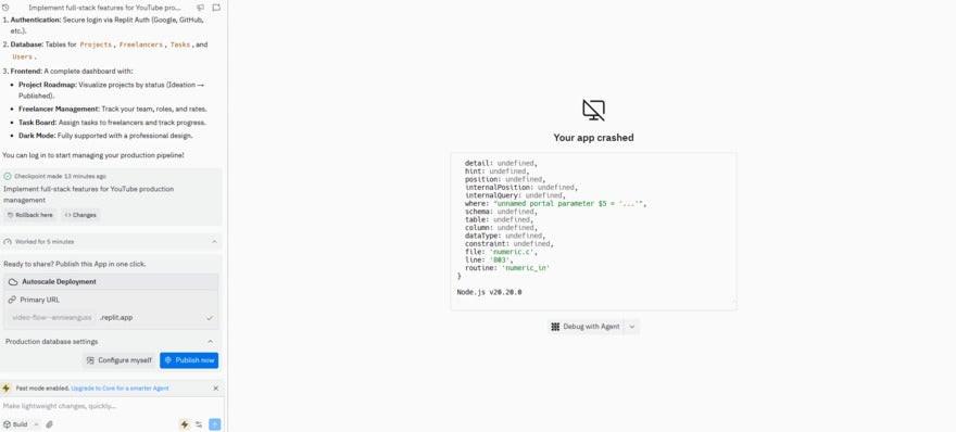 I quickly came across a bug in my Replit project when trying to add a freelancer profile – an action which caused the preview to be replaced with an error message that my app had crashed.