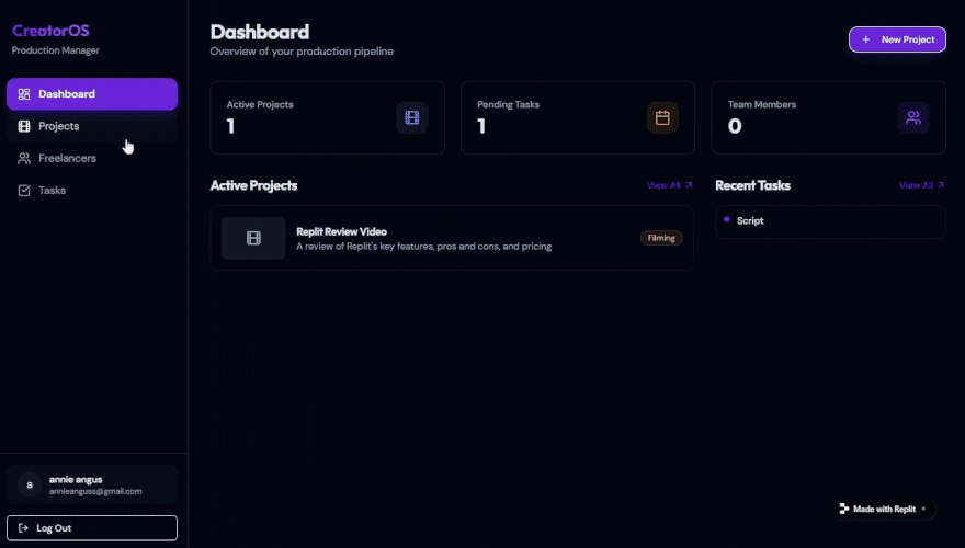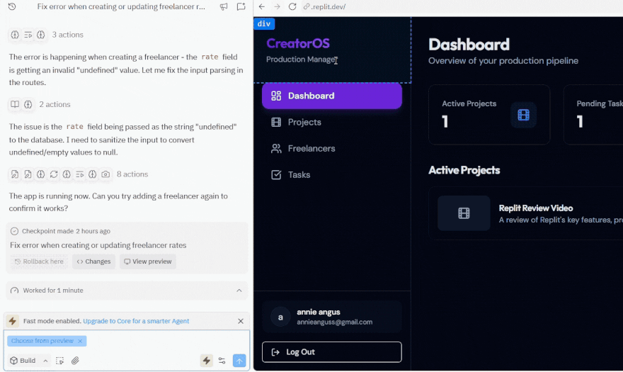Replit Agent took around five minutes to create my draft, and the result was impressive, including an interactive dashboard and project management area. The agent even created user logins, meaning I could invite freelancers working on the project and assign tasks to them.