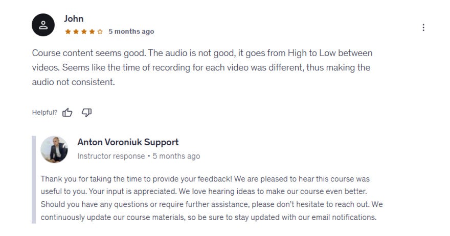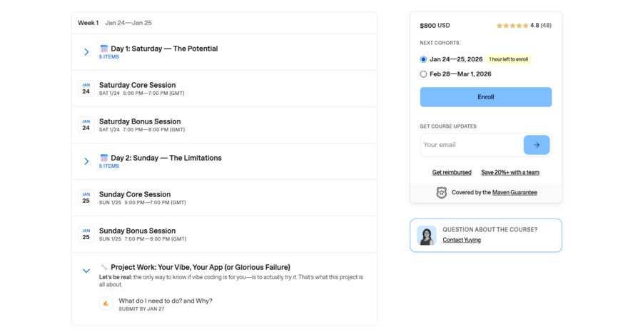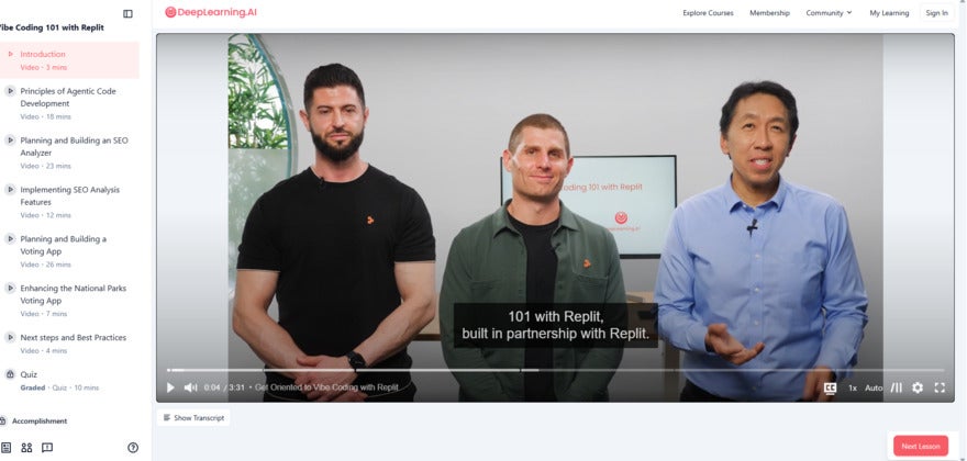 Home » Vibe Coding » Vibe Coding Courses 2026: Our Top Picks Vibe Coding Courses 2026: Our Top Picks We may receive a commission from our partners if you click on a link and purchase a product or service on their website. Learn more Written by Annie Angus Published on January 23, 2026 Comments: 0 On this page #1. Vibe Coding 101 With Replit: DeepLearning.AI #2. Vibe Coding: AI-Driven Software Development and Testing: Udemy #3. Dashboards in Minutes with Claude AI: Udemy #4. Intro to Vibe Coding: Codecademy #5. Vibe Coding Weekend Bootcamp: Maven How To Choose a Vibe Coding Course Extra Resources and Tips Final Thoughts While vibe coding tools are an accessible alternative to coding, the terminology and features can still feel overwhelming for non-coders. Vibe coding courses offer a way to learn these tools straight from the experts with hands on testing.There’s something for everyone on the list below. Whether you’re looking to learn vibe coding fundamentals, perfect your prompt writing, or master a specific platform, I’ve found all the best vibe coding courses available right now. Key Takeaways 🔍 Introductory courses are the best place for beginners to start, since they’re often free and provide helpful platform comparisonsOnce you’ve decided your vibe coding tool, platform-specific courses, such as “Vibe Coding 101 with Replit,” will teach you how to make the most out of your platformIf you want to try multiple courses on Udemy or Coursea, you can save money by subscribing to their monthly subscriptions. For example, Udemy courses start from $19.99, but its $14-per-month subscription provides unlimited accessWhen choosing your vibe coding course, think about your learning style, and be realistic with how much money and time you can spare. #1. Vibe Coding 101 With Replit: DeepLearning.AI Price: FreePlatforms used: ReplitCourse length: 1 hour 44 minutesExperience Level: BeginnerVibe Coding 101 is Replit’s official course. The follow-along course, taught by Replit’s President Michele Catasta and Matt Palmer, its Head of Development, will walk users through the process of building and hosting two apps: An SEO analyzer and a voting app.This course will be most useful for users interested in Replit specifically, and it’s a great way to learn what the platform has to offer before committing to a paid plan. Still, the general skills and best practices can be applied to other platforms.Best for: Beginners with basic coding and prompting experience, code enthusiasts, students and small business owners on a budgetTry the course here: Vibe Coding 101 with Replit This course has three teachers, who are all introduced at the beginning. Source: Website Builder Expert #2. Vibe Coding: AI-Driven Software Development and Testing: Udemy Price: $19.99Platforms used: Cursor, Lovable, WindsurfCourse length: 3 hours 47 minutesExperience Level: BeginnerTaught by Software Developer Valentin Despa, the course introduces the fundamentals of vibe coding, then dives into three hour-long sessions on Cursor, Lovable, and Windsurf. It introduces the key features of each platform, along with helpful best tips on writing AI prompts and basic tests to verify app functionality.A 4.5 star rating and over 1,700 reviews makes this one of the most popular vibe coding courses for beginners on Udemy.For $19.99, the course includes:17 downloadable resourcesCertificate upon completionBest for: Beginners unsure of which platform to chooseTry the course here: Vibe Coding: AI-Driven Software Development and TestingThe course uses fun illustrations to demonstrate ideas. Source: Website Builder Expert #3. Dashboards in Minutes with Claude AI: Udemy Price: $19.99Platforms used: ClaudeAICourse length: 39 minutesExperience Level: Beginner“Dashboards in Minutes” will show you how to create interactive dashboards to visualize data using ClaudeAI. With a CSV file and complete prompt templates, this follow-along course is easy to understand and apply to your own use cases.While one of the shortest vibe coding courses on this list, the clear, straight-to-the-point teaching of Federico Garay has earnt the course a strong 4.5 star rating on Udemy. Garay is also a certified Instructor Partner at Udemy, which guarantees a high quality of teaching from his courses.At the price of $19.99, you’ll receive:Real downloadable sales data to practice with Certificate upon completionBest for: Businesses tracking customer data and product sales, freelancers sharing metrics with clientsTry the course here: Dashboards in Minutes with Claude AIThe course teacher provided a helpful screen recording to demonstrate his process. Source: Website Builder Expert #4. Intro to Vibe Coding: Codecademy Price: FreePlatforms used: Codecademy and CursorCourse length: One hourExperience Level: BeginnerCodecademy’s “Intro to Vibe Coding” course is an extremely beginner friendly overview to vibe coding. Nitya Mandyam, Codecademy’s Senior Curriculum Developer, walks you through the history of vibe coding and helps you create a web app with Cursor.The main standout of this free course is the access to Codecademy’s AI Learning Assistant. This tool will walk you through developing a project of your choice and answer any questions you have along the way, which makes it more personal than the typical follow-along tutorials.The Codecademy platform also supports with job interviews and provides a certificate upon completion for premium subscribers.Best for: Students, code enthusiasts, career switchersTry the course here: Intro to Vibe CodingCodecademy uses a variety of interactive teaching methods, such as video lectures, flashcards, and practical tasks. Source: Website Builder Expert #5. Vibe Coding Weekend Bootcamp: Maven Price: $800Platforms used: Lovable, Replit, BoltCourse length: Six hoursExperience Level: BeginnerWith a mix of lectures and breakout groups, this vibe coding bootcamp teaches you every stage of app development, from UI to 